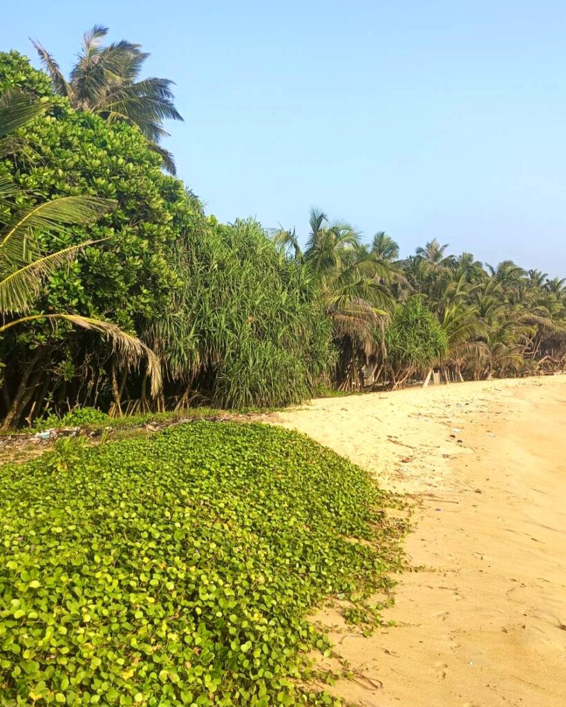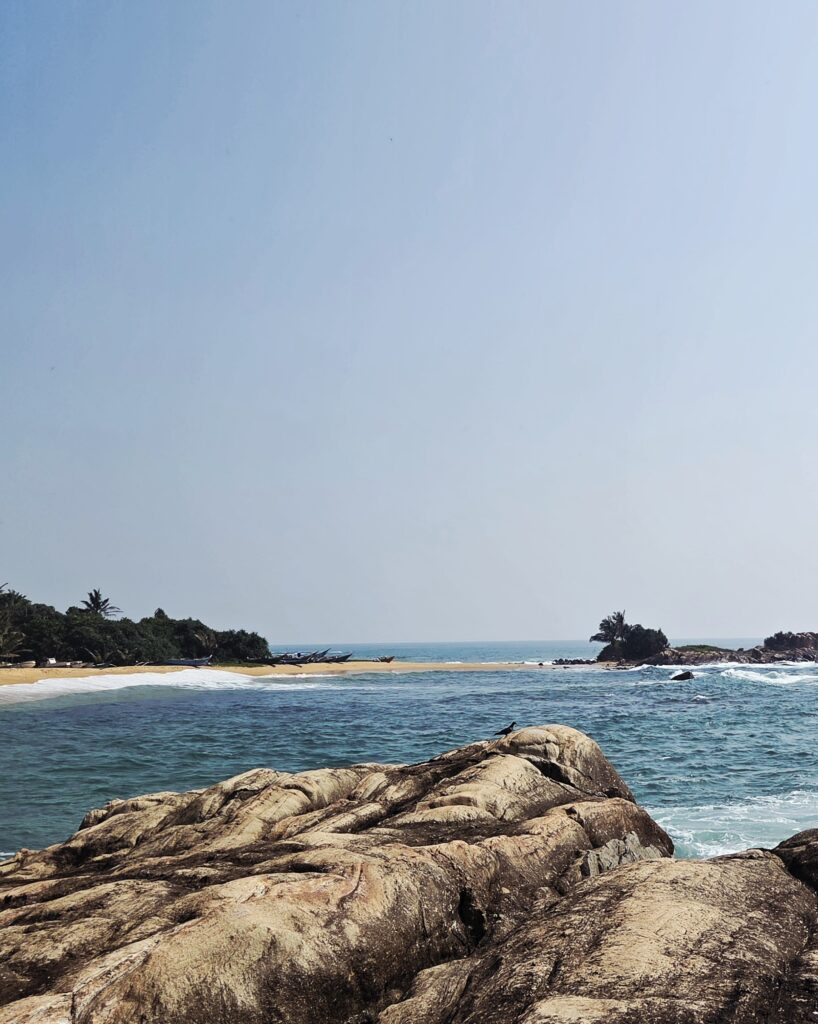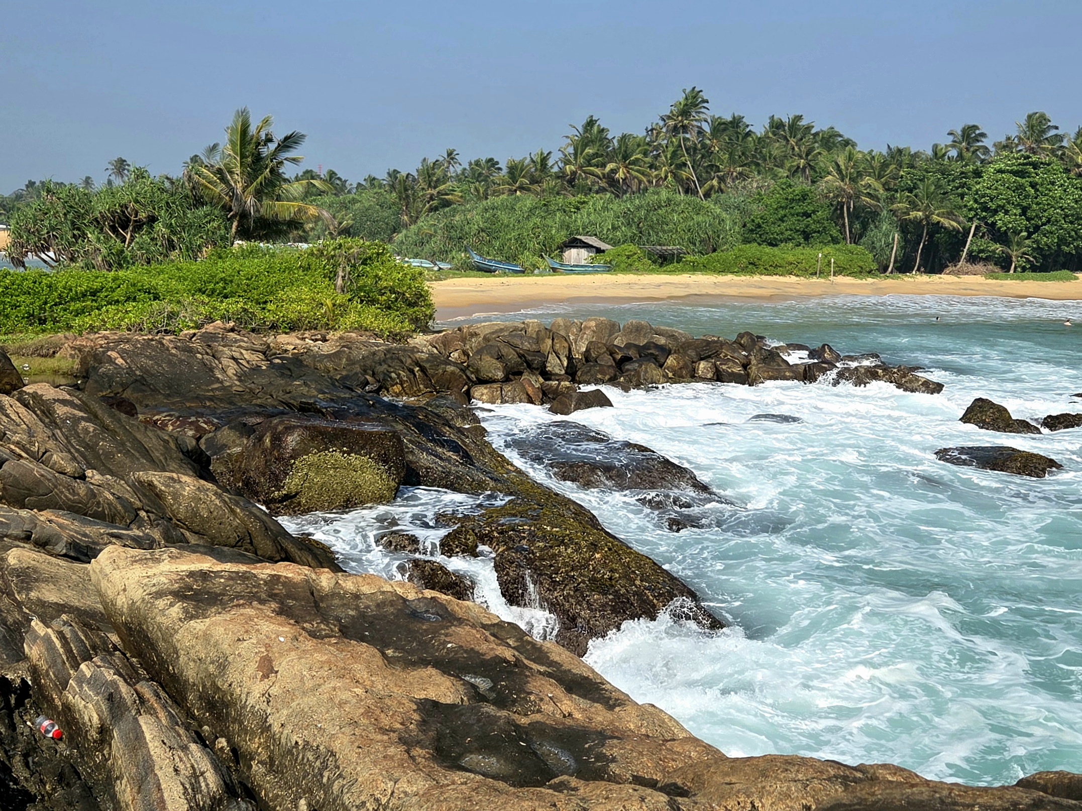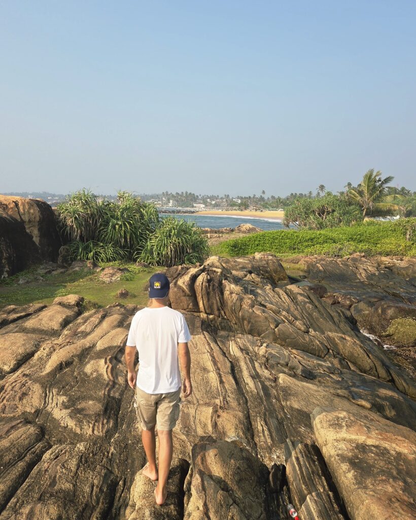 Na końcu plaży krajobraz zmienia się jeszcze raz. Pojawia się Dudanduwa Cliff — porośnięta zielenią formacja skalna, wciśnięta prosto w ocean. Tu robi się najciszej. Słychać tylko fale rozbijające się o skały, wiatr i własne myśli. Krajobraz trochę jak z Seszeli, tylko bez tłumu, bez biletów i bez plastikowej oprawy „atrakcji turystycznej”. Można tu siedzieć godzinami — w cieniu, na słońcu, bez planu i bez potrzeby robienia czegokolwiek. stamtąd jeszcze parę minut między domostwami i znaleźliśmy się na Dodanduwa Beach.