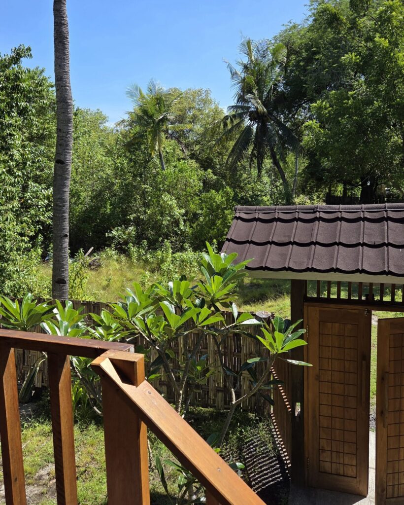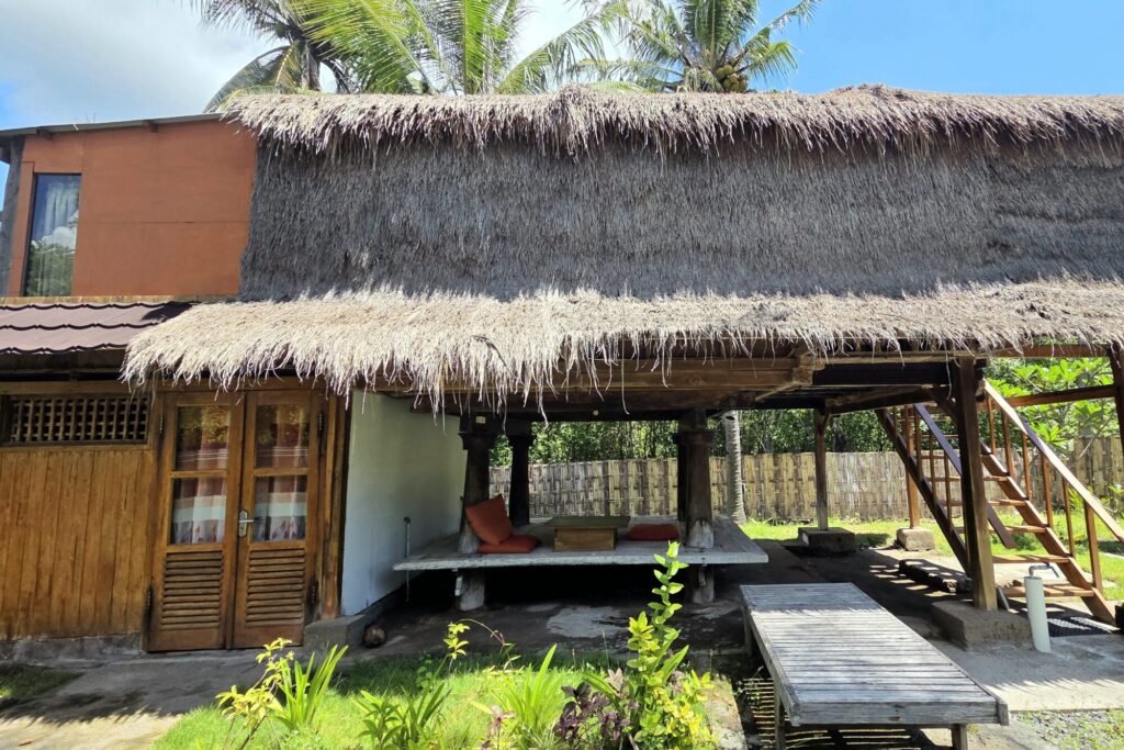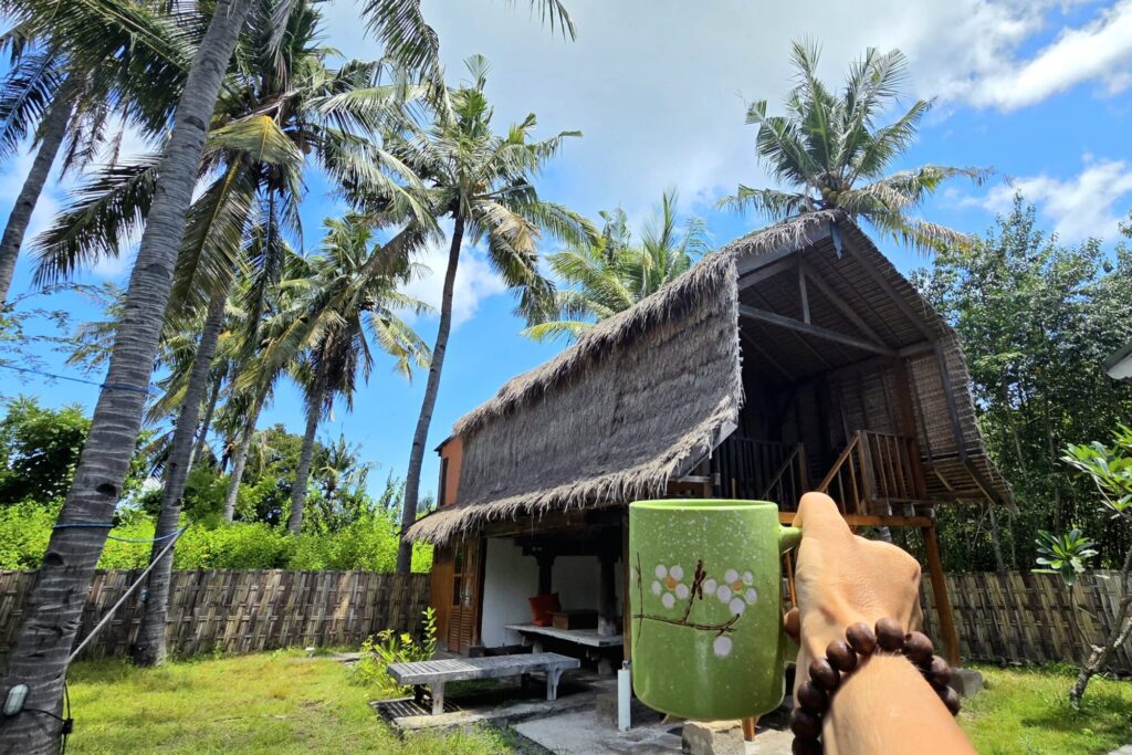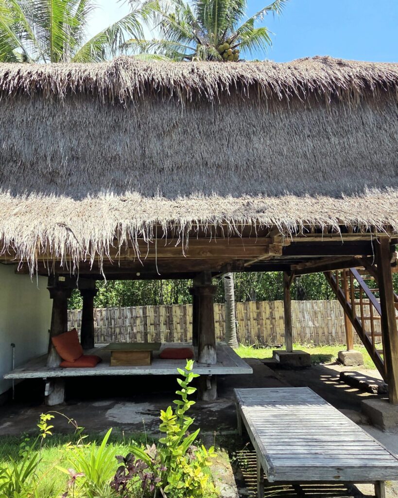 Dom, który stał się naszą miejscówką na czas spędzony na Meno, nie był produktem zbudowanym typowo pod turystę, żeby mógł on „poczuć klimat”. Nasze tymczasowe M było oryginalną chatą rumah panggung, która sprowadzona została na Gili kilka lat wcześniej z sąsiedniego Lomboku. Jedynym ukłonem w stronę osób nie do końca przyzwyczajonych do mocno skromnych warunków była łazienka. Niewielka, skromna, dobudowana na tyłach chaty – już na poziomie 0. Nie było w niej ciepłej wody, a ta, która leciała z kranu i spod prysznica była słonawa, ale – mieliśmy łazienkę w obrębie domku, nie trzeba było jej szukać w innej części ogrodu, to niebywały plus.