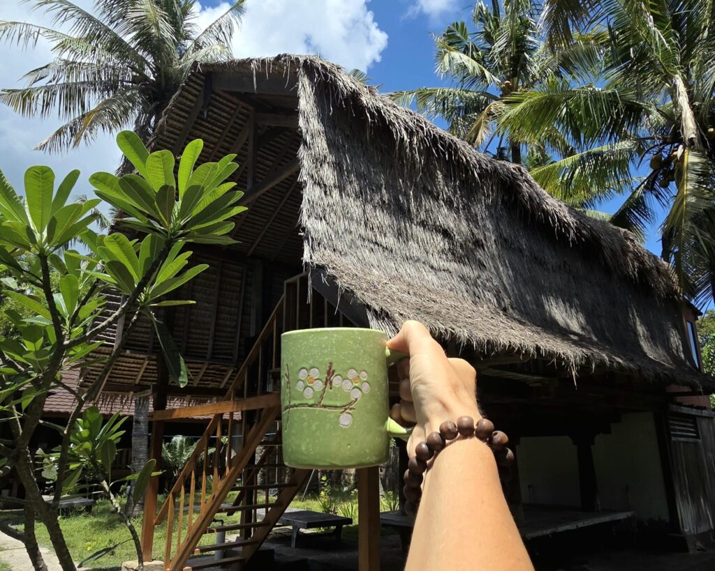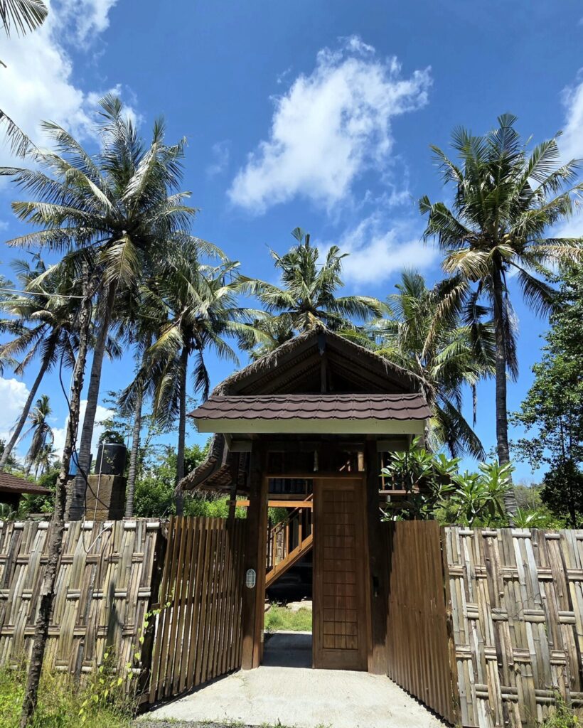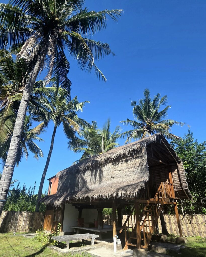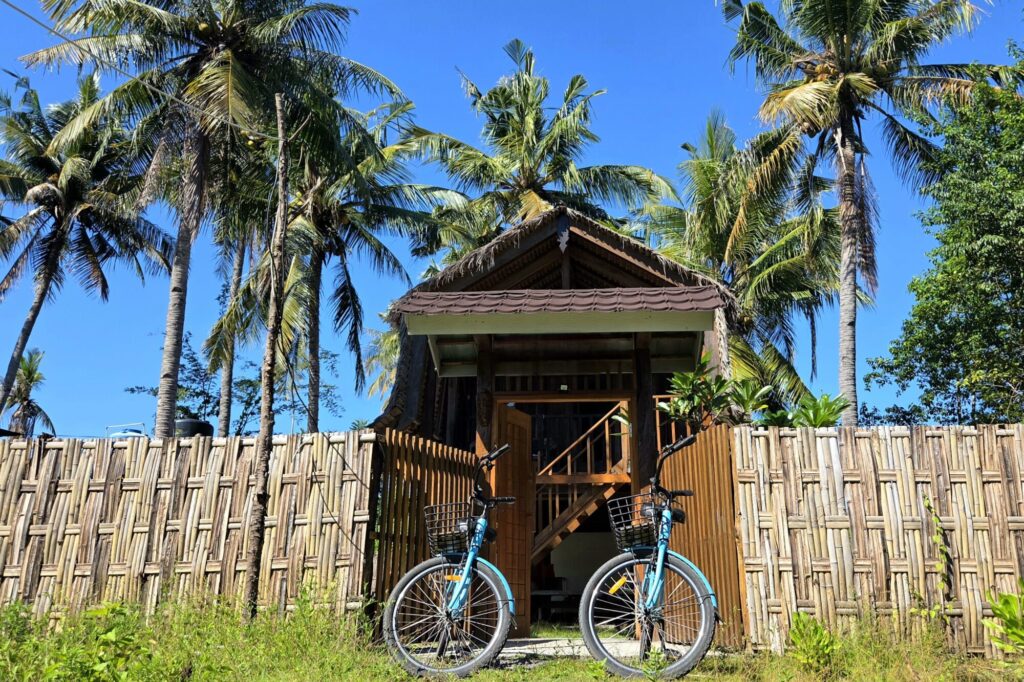 Dom, który stał się naszą miejscówką na czas spędzony na Meno, nie był produktem zbudowanym typowo pod turystę, żeby mógł on „poczuć klimat”. Nasze tymczasowe M było oryginalną chatą rumah panggung, która sprowadzona została na Gili kilka lat wcześniej z sąsiedniego Lomboku. Jedynym ukłonem w stronę osób nie do końca przyzwyczajonych do mocno skromnych warunków była łazienka. Niewielka, skromna, dobudowana na tyłach chaty – już na poziomie 0. Nie było w niej ciepłej wody, a ta, która leciała z kranu i spod prysznica była słonawa, ale – mieliśmy łazienkę w obrębie domku, nie trzeba było jej szukać w innej części ogrodu, to niebywały plus.