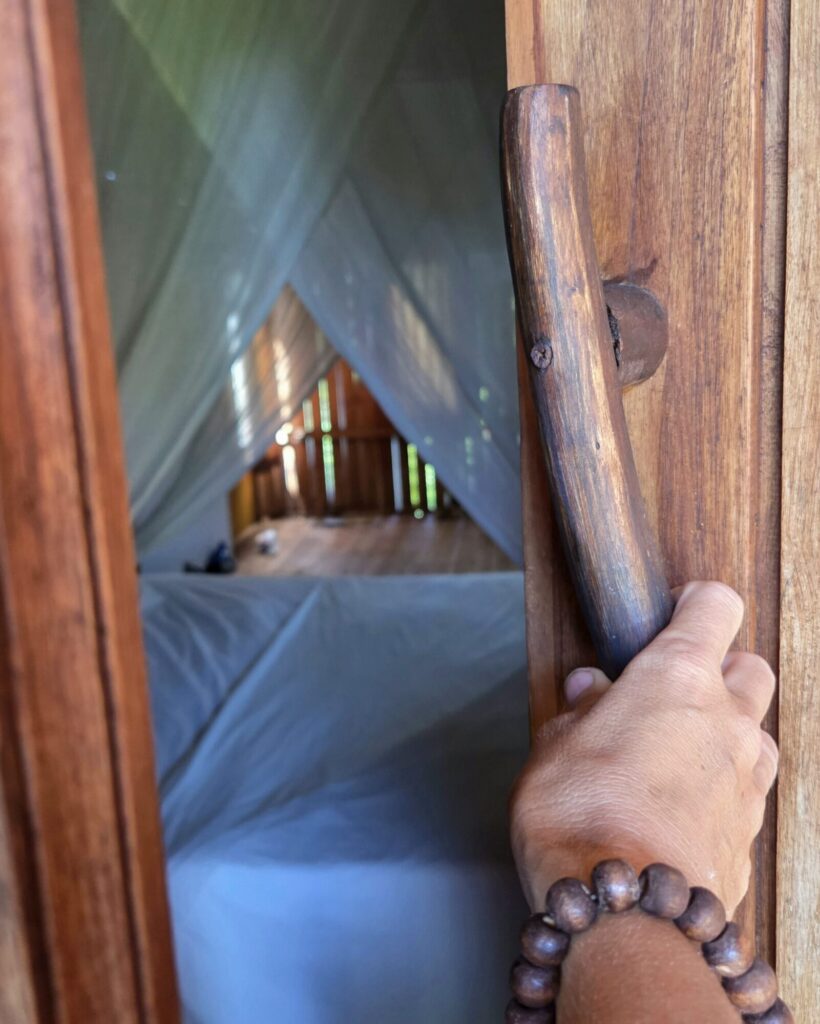 Nasza chata składała się z drewnianej werandy, gdzie można było usiąść i cieszyć się odgłosami natury o każdej porze dnia i nocy, dużego pomieszczenia będącego i pokojem dziennym i sypialnią, z bambusową podłogą, ścianami z drewna i strzechą na dachu, skromnej łazienki, w skład której wchodziła toaleta, umywalka plus prysznic, z którego płynęła zimna słonawa woda.