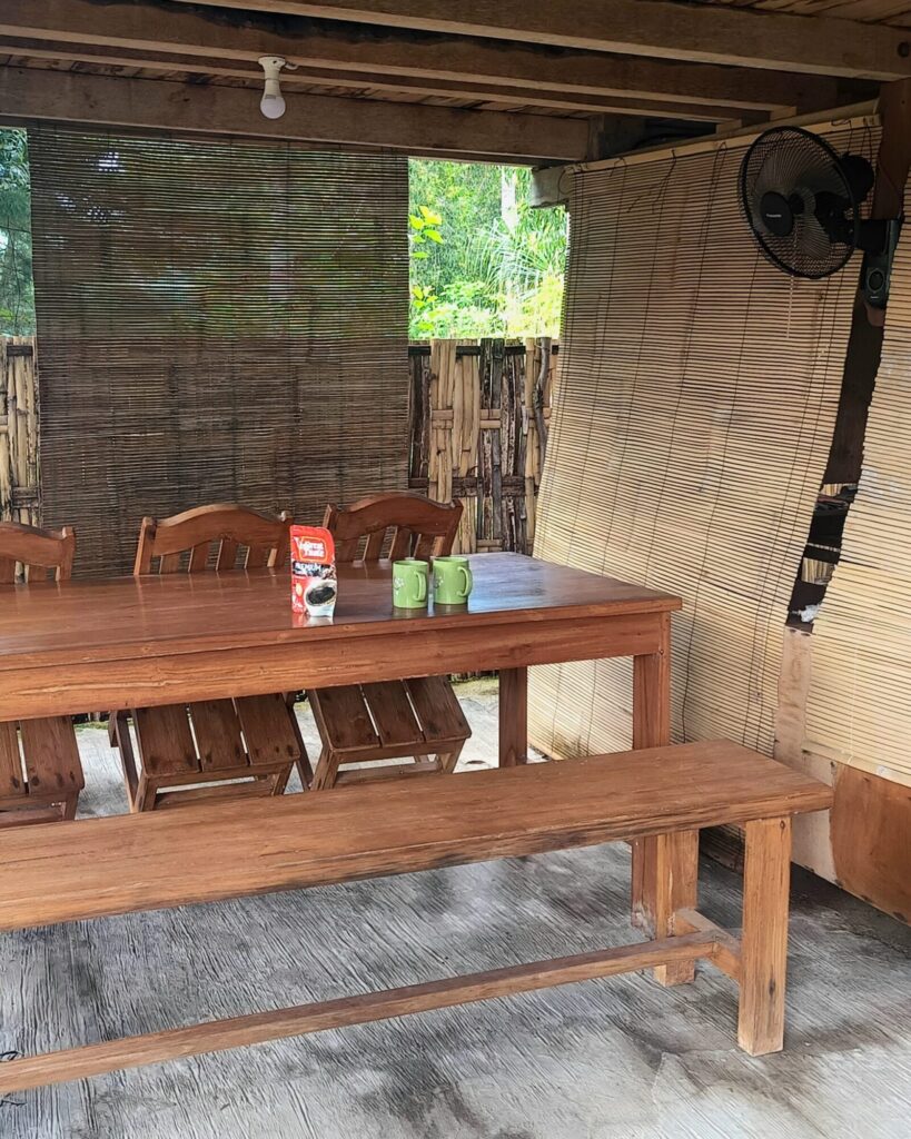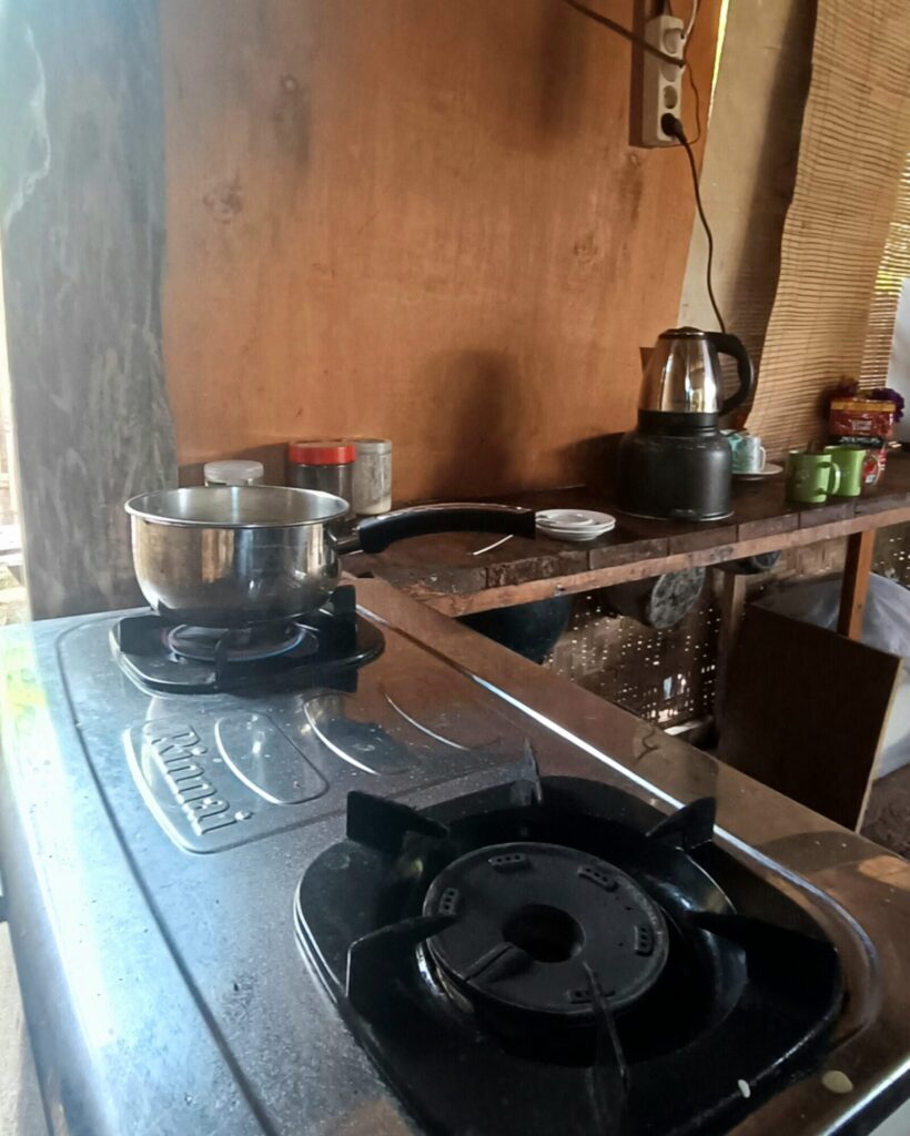 Ale wracając do samej chaty. W naszej mieliśmy również prąd, co w tropikach jest ogromnym atutem i kuchnię – na świeżym powietrzu, lecz pod zadaszeniem. Wraz ze stołem i wygodnymi ławami znajdowała się w innej części ogrodu. To tu powstawały najwspanialsze pancake’i z bananami i smoothie z papai, bo kuchnia, zasilana prądem, posiadała też infrastrukturę umożliwiającą swobodne gotowanie podstawowych potraw.